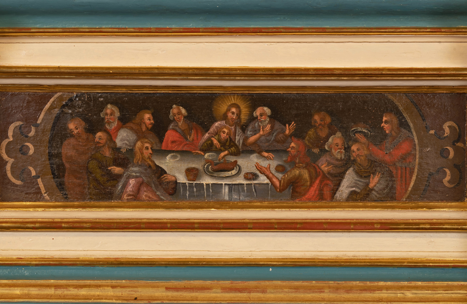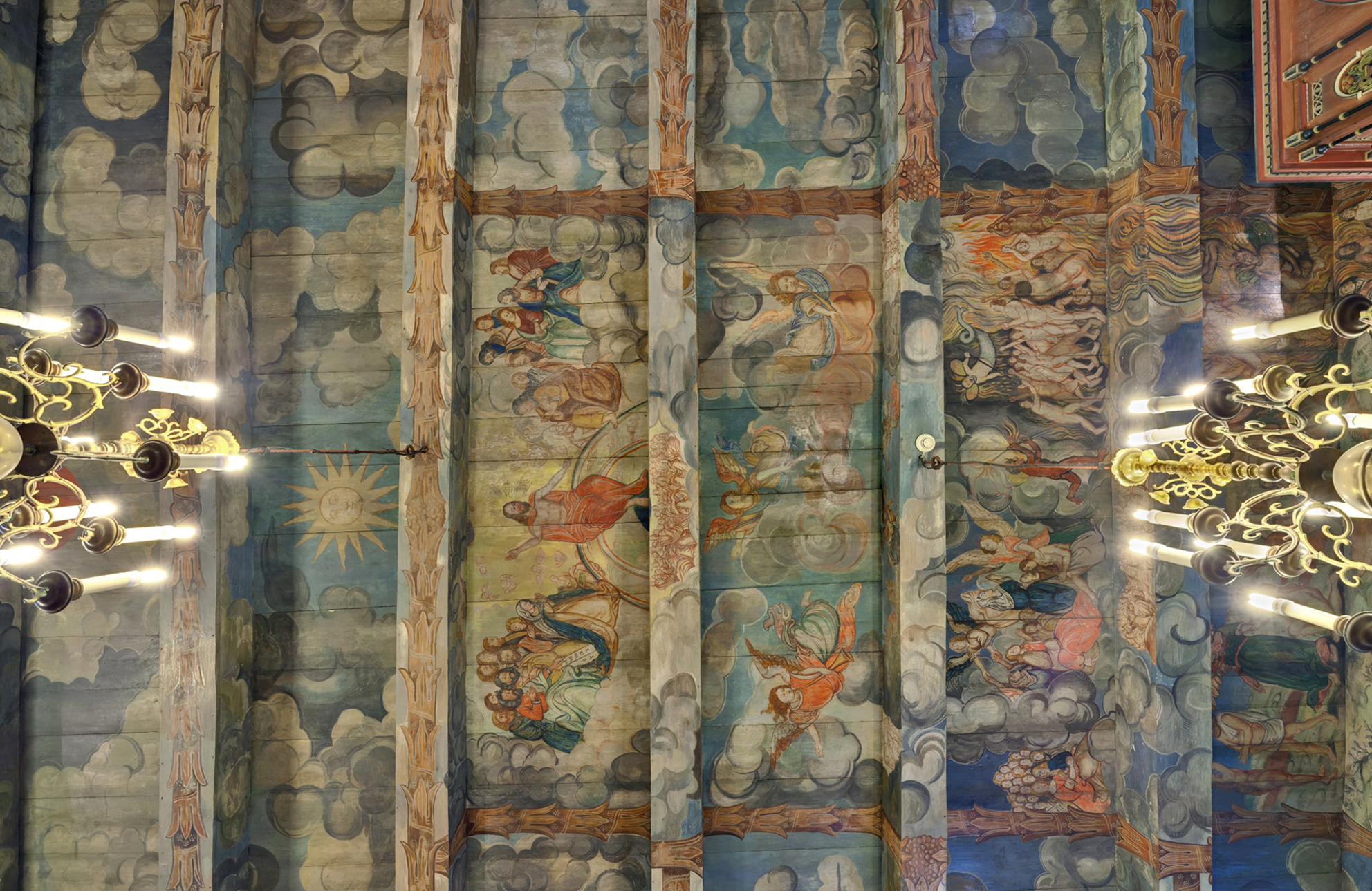 Centrum zajmuje postać Chrystusa Sędziego siedzącego na łuku tęczy w otoczeniu apostołów, starców apokalipsy oraz Marii i Jana Chrzciciela oraz aniołów obwieszczających koniec świata. Dolną strefę kompozycji wypełniają postaci powstających z grobów zmarłych. W prezbiterium znajdują się przedstawienia Boga Ojca i Chrystusa (Trójcę Św. dopełnia gołębica w zwieńczeniu ołtarza).