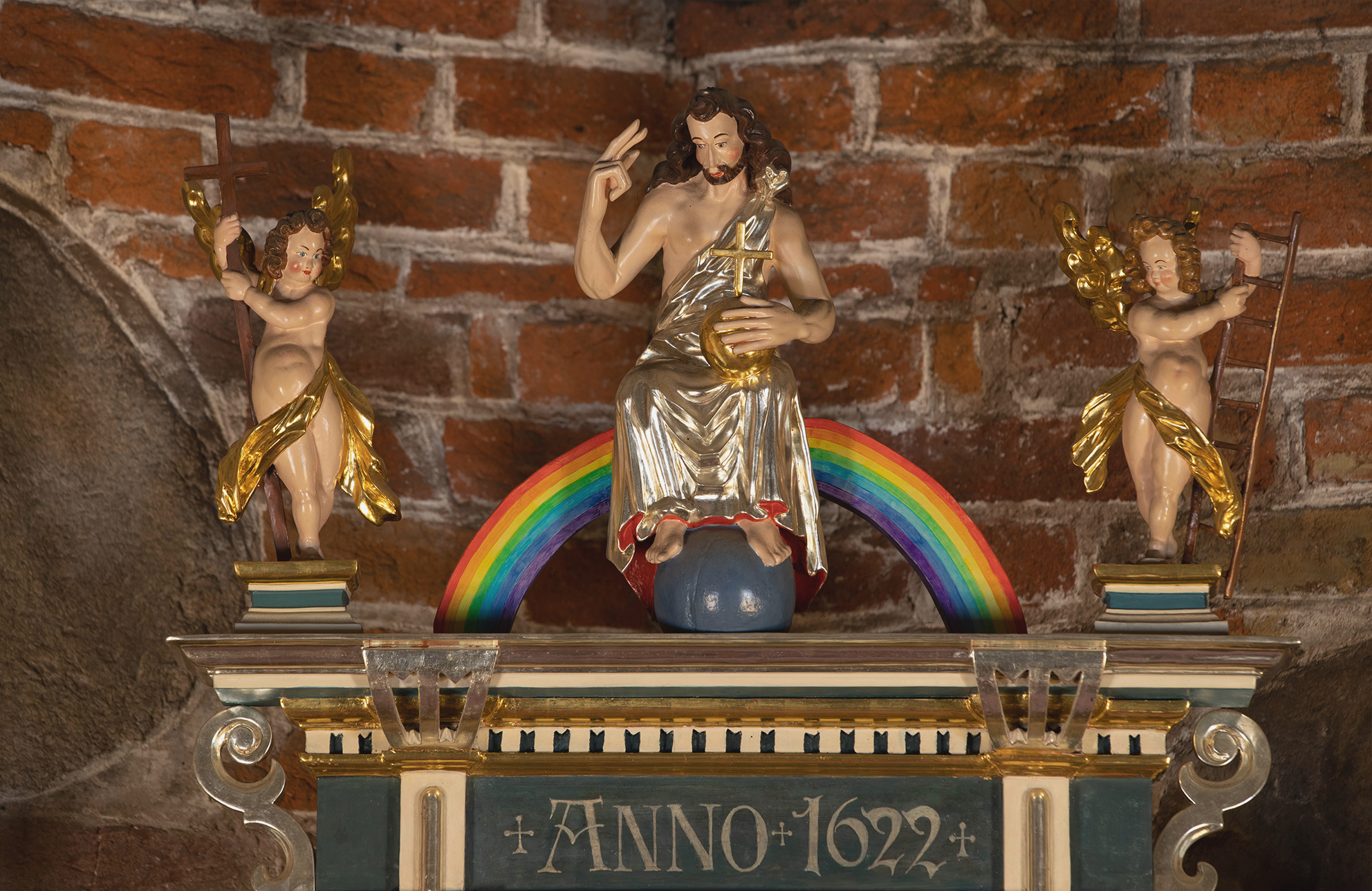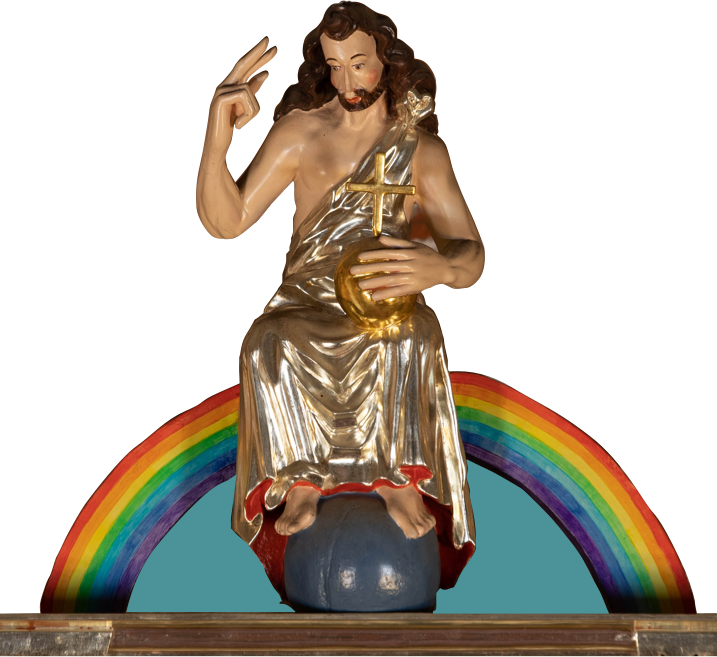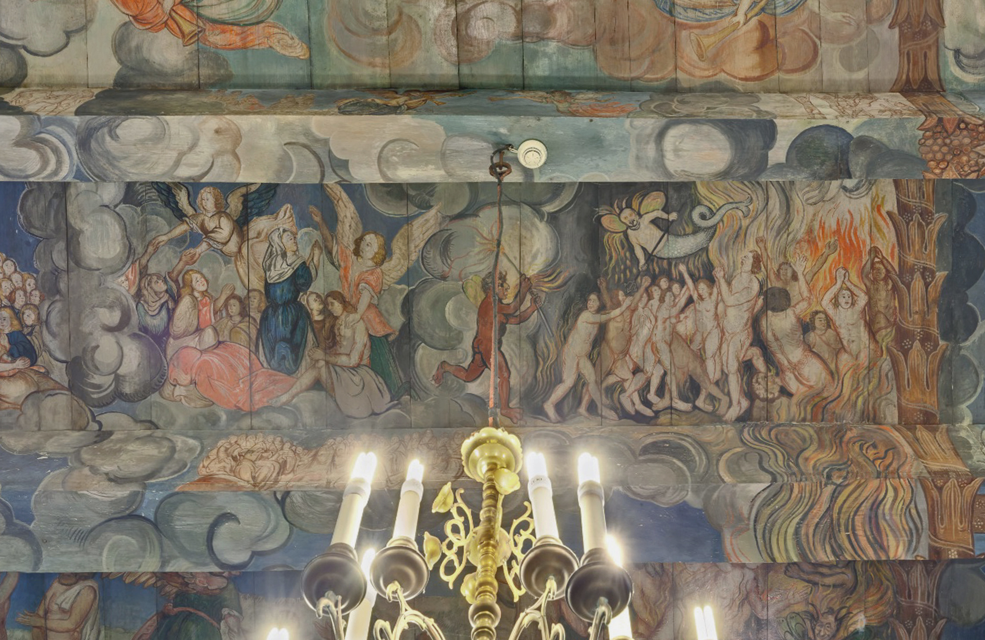 Centrum zajmuje postać Chrystusa Sędziego siedzącego na łuku tęczy w otoczeniu apostołów, starców apokalipsy oraz Marii i Jana Chrzciciela oraz aniołów obwieszczających koniec świata. Dolną strefę kompozycji wypełniają postaci powstających z grobów zmarłych. W prezbiterium znajdują się przedstawienia Boga Ojca i Chrystusa (Trójcę Św. dopełnia gołębica w zwieńczeniu ołtarza).
