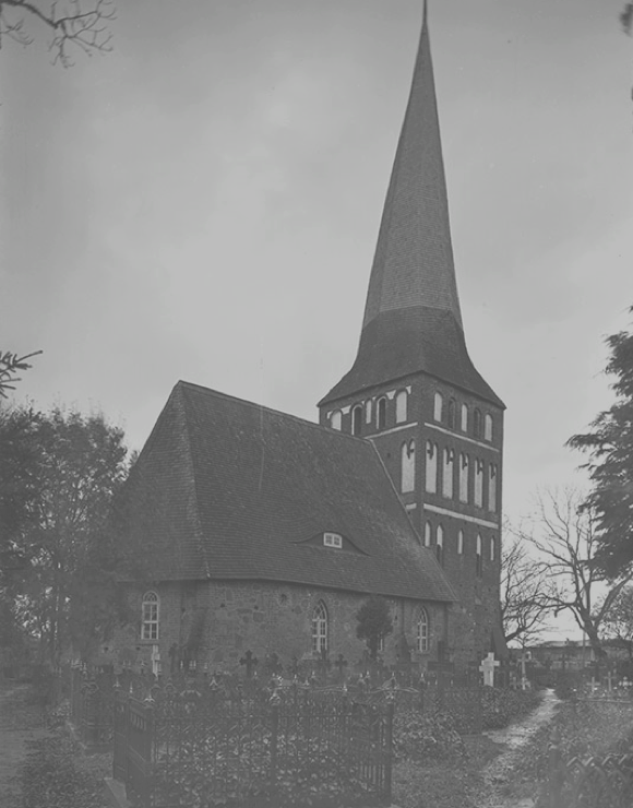 Na szczycie wieży znajduje się wiatrowskaz - ażurowy kogut stojący na kuli, z datą 1663. Elewacje wieży ozdobione zostały bogatą dekoracją z blend w zmiennym rytmie. Przykrywa ją ostrosłupowy dach, natomiast nad nawą znajduje się stromy dach, dwuspadowy. W XIX wieku po południowej stronie nawy dobudowana została zakrystia.